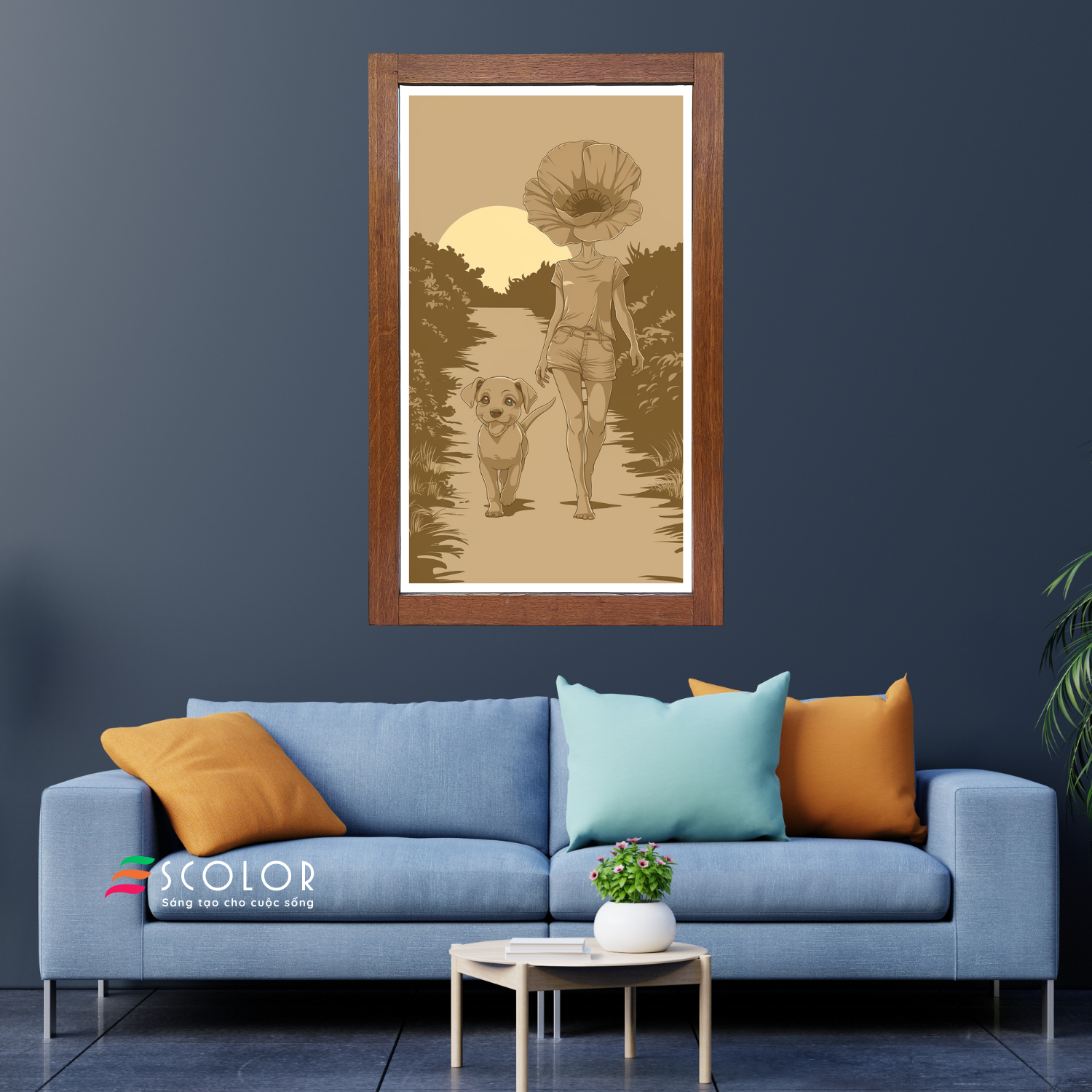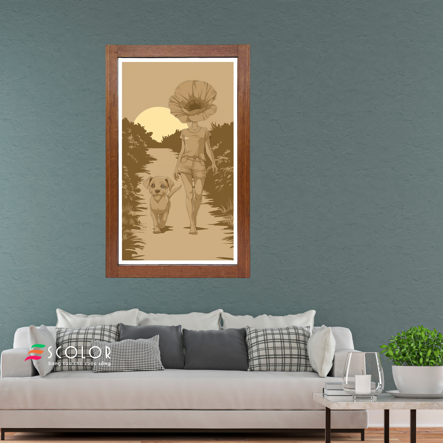 Bức tranh miêu tả một cô gái với đầu là một bông hoa lớn đang đi dạo cùng một chú chó nhỏ trên con đường quê. Màu sắc của tranh mang tông nâu sepia, tạo nên cảm giác cổ điển và yên bình. Cô gái mặc quần short và áo phông, bước đi nhẹ nhàng và thoải mái, trong khi chú chó nhỏ tỏ ra vui vẻ và háo hức bên cạnh. Bối cảnh xung quanh là hàng cây xanh mướt và mặt trời đang lặn phía xa, tạo nên một khung cảnh hoàng hôn đẹp mắt và tĩnh lặng. Bức tranh mang lại cảm giác gần gũi và bình yên của cuộc sống nông thôn.