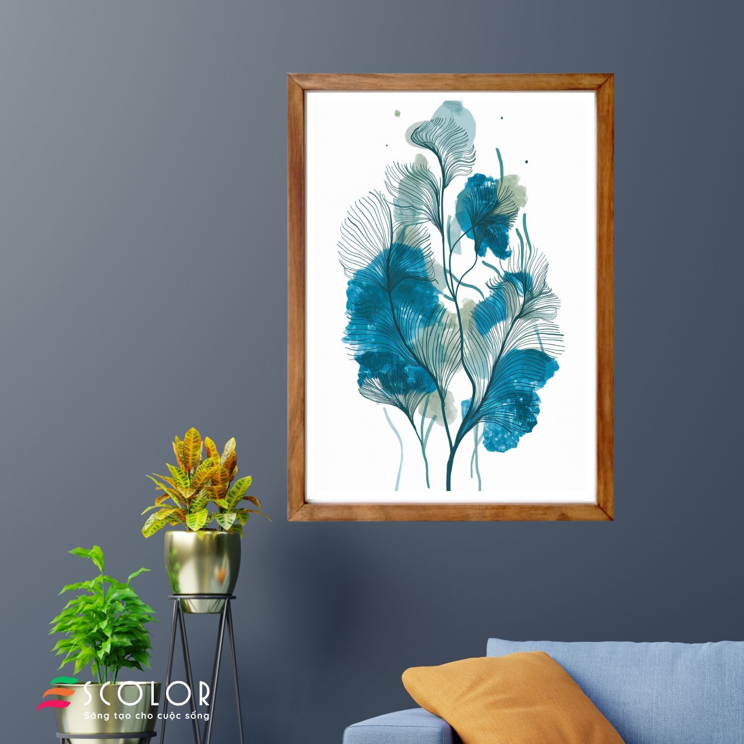 Bức tranh này khắc họa những chiếc lá mỏng manh và uyển chuyển, được tô điểm bằng màu xanh lam và xanh ngọc bích tinh tế. Những nét vẽ mềm mại và chi tiết, tạo nên sự nhẹ nhàng và thanh thoát. Các vệt màu nước lan tỏa như những giọt sương, mang lại cảm giác tươi mới và mát mẻ. Sự kết hợp hài hòa giữa màu sắc và hình dáng làm nổi bật vẻ đẹp tự nhiên và tinh khiết. Đây là một tác phẩm nghệ thuật đầy cảm hứng, gợi lên cảm giác bình yên và sự kết nối sâu sắc với thiên nhiên.