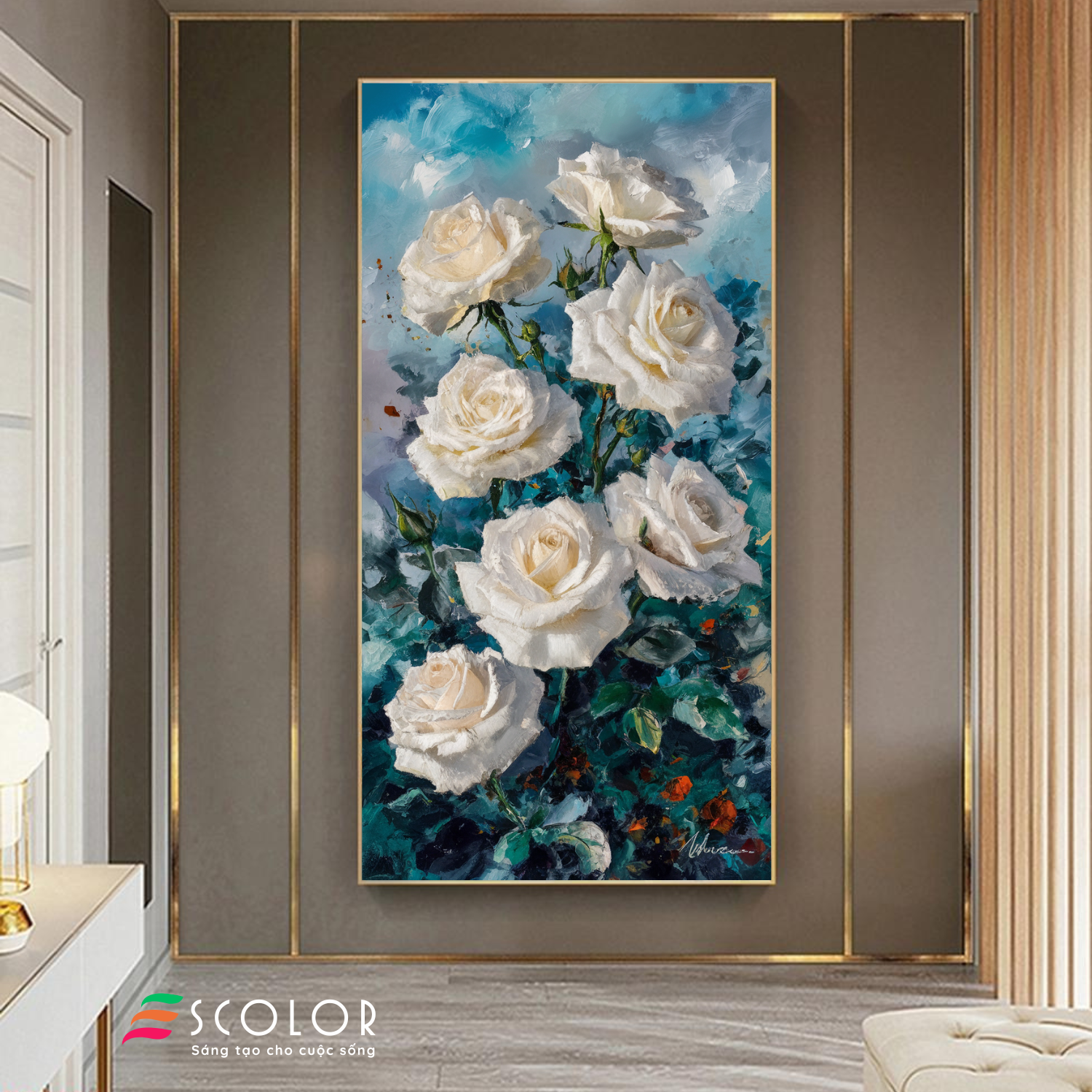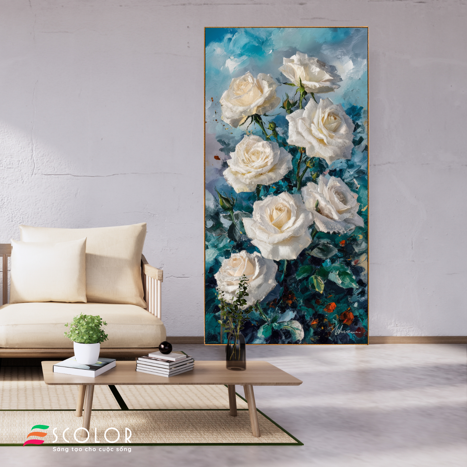 Bức tranh này miêu tả những bông hồng trắng tinh khôi đang nở rộ, tạo nên một cảnh tượng thanh khiết và tinh tế. Màu trắng của những cánh hoa nổi bật trên nền xanh của lá và bầu trời, mang đến cảm giác thanh bình và hy vọng. Bức tranh sử dụng kỹ thuật vẽ sơn dầu, tạo ra những lớp màu sắc đậm nét và sống động. Những bông hồng trắng tượng trưng cho sự trong sáng và tình yêu thuần khiết, làm cho người xem cảm thấy bình yên và tràn đầy cảm xúc.
