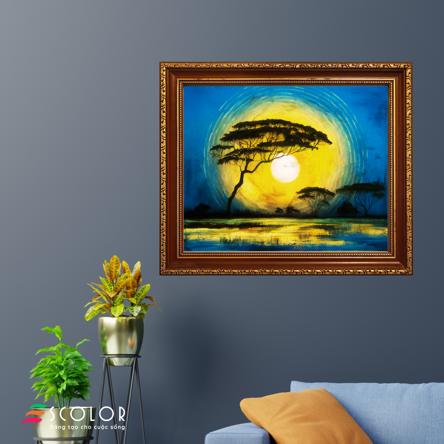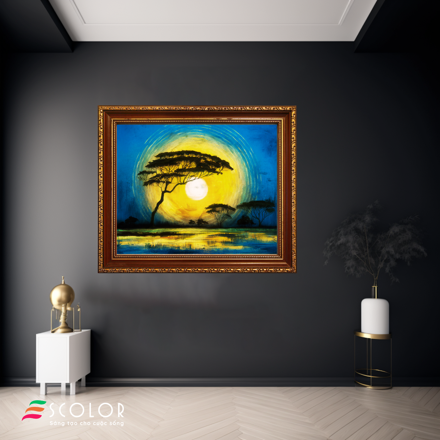 Bức tranh này miêu tả một cảnh hoàng hôn yên bình trên vùng đồng cỏ châu Phi. Mặt trời lớn và rực rỡ, được vẽ bằng màu vàng sáng, nổi bật trên nền trời xanh thẫm. Các cây baobab đen nhánh với hình dáng độc đáo, nghiêng mình trước ánh mặt trời, tạo ra sự tương phản tuyệt đẹp. Những vòng tròn màu sắc bao quanh mặt trời, như tượng trưng cho sức mạnh và sự ấm áp. Bức tranh gợi lên cảm giác bình yên, hùng vĩ và sự kỳ diệu của thiên nhiên hoang dã.