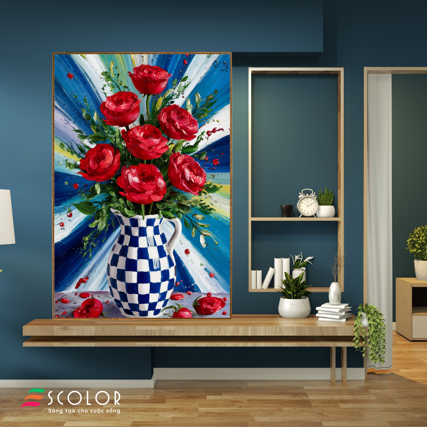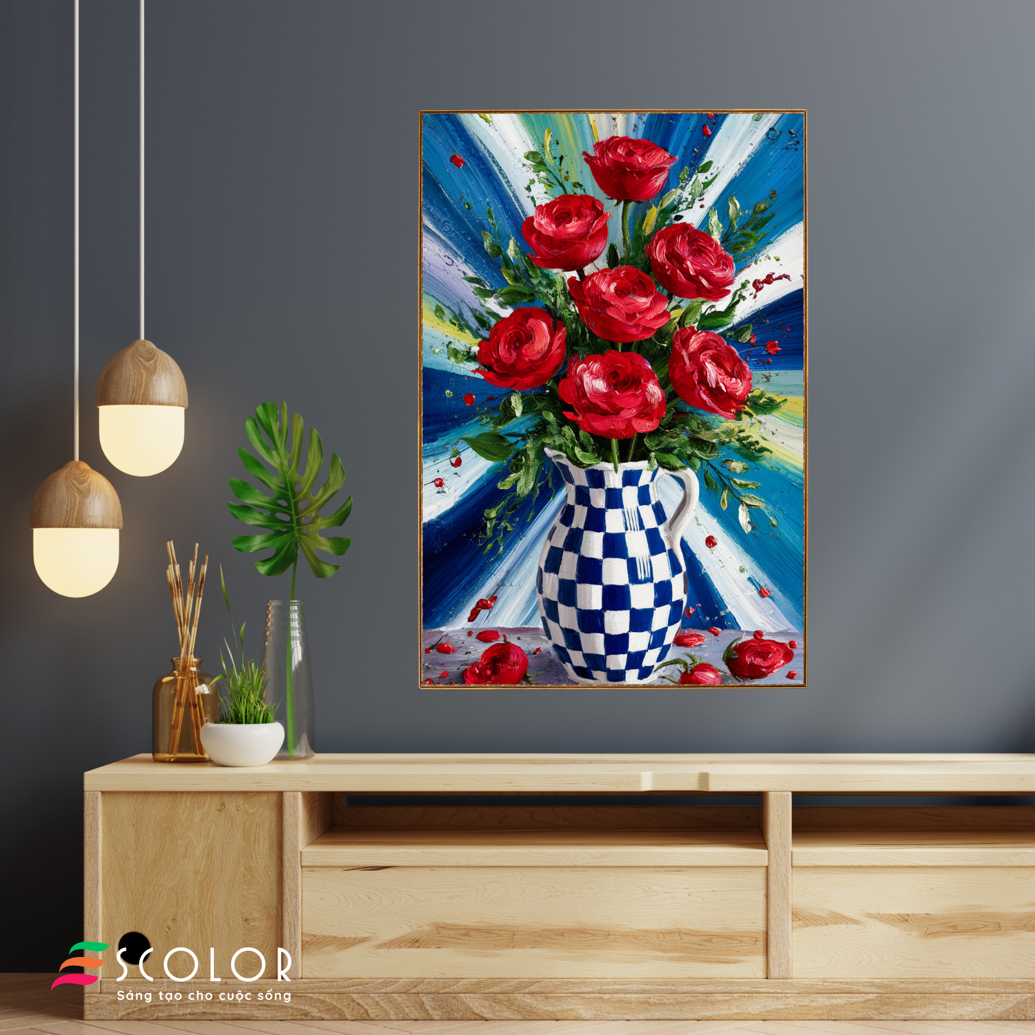 Bức tranh này thể hiện một bình hoa với những bông hoa hồng đỏ rực rỡ, nổi bật trên nền màu xanh dương và trắng. Những cánh hoa được vẽ tinh tế, với các chi tiết sắc nét và màu sắc tươi sáng. Bình hoa có họa tiết ô vuông trắng xanh, tạo điểm nhấn hài hòa cho tổng thể bức tranh. Bối cảnh phía sau là những đường nét màu xanh và trắng, tạo cảm giác như ánh sáng tỏa ra từ những bông hoa, làm tăng thêm vẻ đẹp và sự sống động cho tác phẩm. Bức tranh mang lại cảm giác tươi mới và niềm vui cuộc sống.