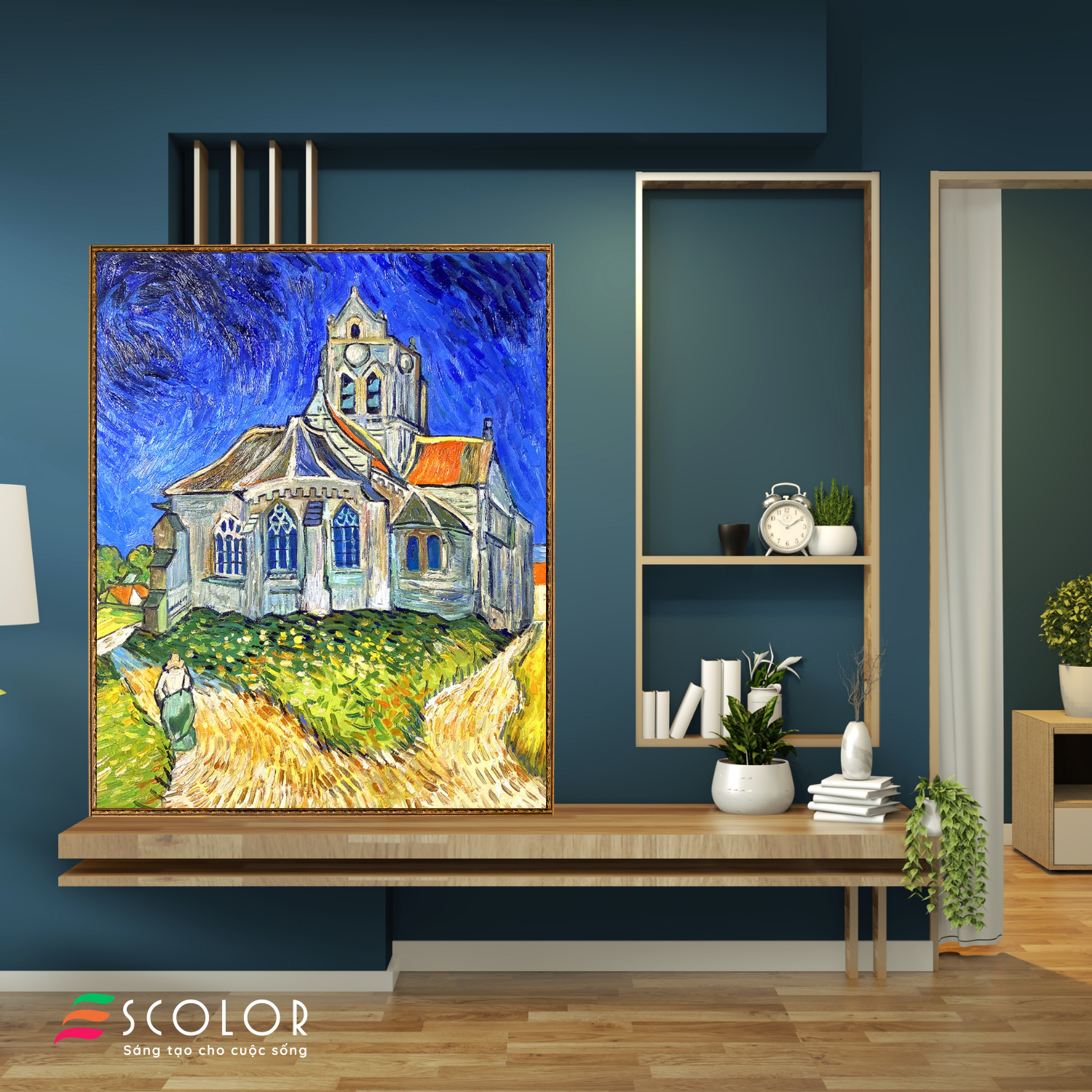 Bức tranh này miêu tả một nhà thờ cổ kính đứng sừng sững giữa khung cảnh nông thôn yên bình. Bầu trời xanh đậm với những nét cọ xoáy tạo nên một không gian đầy cảm xúc và động lực. Mái nhà thờ màu cam và trắng nổi bật giữa màu xanh của bầu trời và cây cỏ xung quanh. Một con đường nhỏ dẫn tới nhà thờ, nơi một người phụ nữ đang đi bộ, mang lại cảm giác bình yên và tĩnh lặng. Các chi tiết kiến trúc tinh tế của nhà thờ kết hợp với cảnh vật thiên nhiên xung quanh tạo nên một bức tranh đầy sức sống và gợi cảm. Bức tranh này không chỉ là một tác phẩm nghệ thuật mà còn là biểu hiện của sự hòa quyện giữa con người và