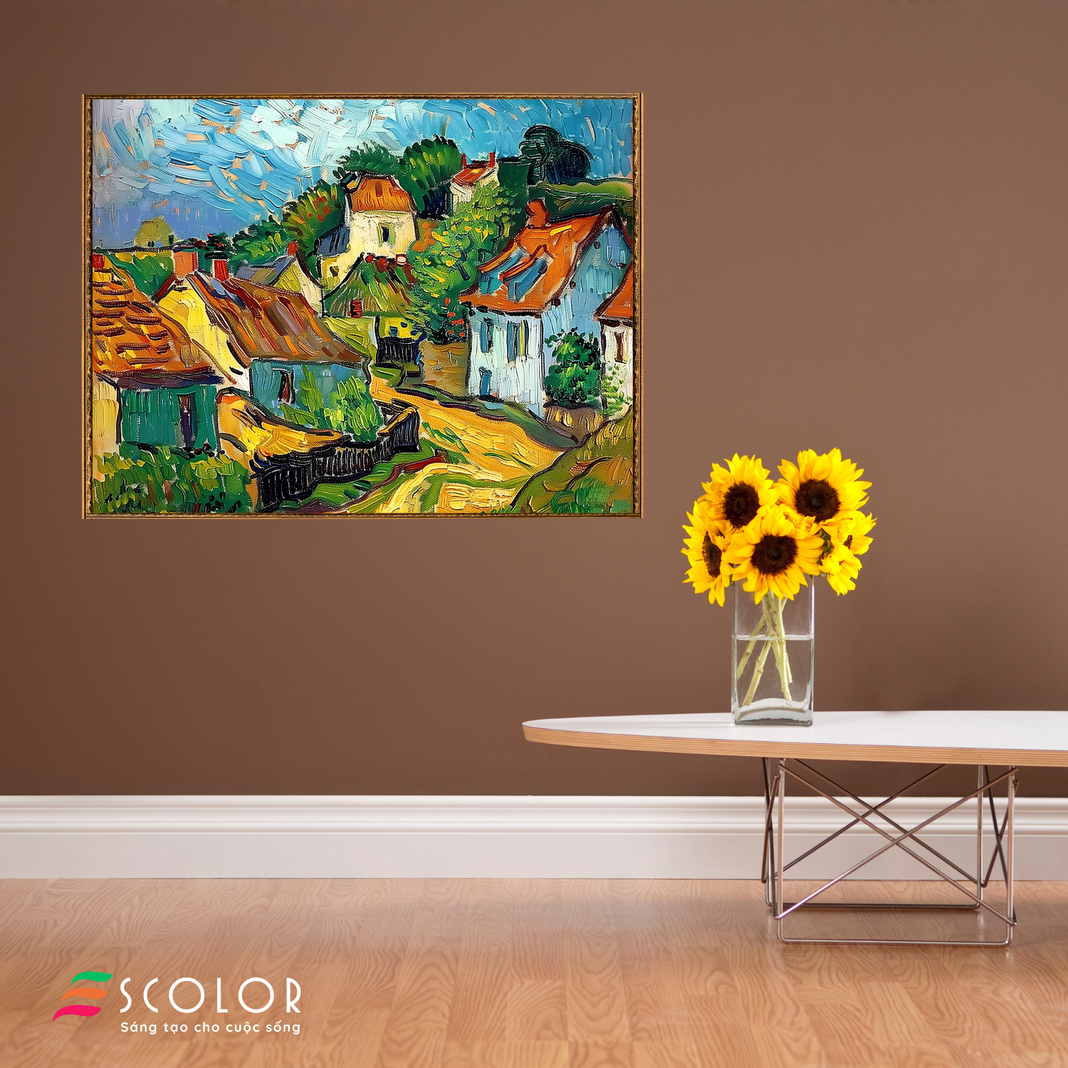 Bức tranh miêu tả một ngôi làng nhỏ với những ngôi nhà mái ngói đỏ và tường trắng, được bao quanh bởi cây cối xanh tươi và con đường đất vàng uốn lượn. Các ngôi nhà có kiến trúc đơn giản nhưng ấm cúng, nằm rải rác trên đồi. Bầu trời xanh mát với những đám mây trắng nhẹ nhàng trôi, tạo nên một khung cảnh yên bình và tươi đẹp. Các nét vẽ mạnh mẽ và màu sắc tươi sáng mang lại cảm giác sống động và gần gũi, thể hiện vẻ đẹp mộc mạc của cuộc sống nông thôn.