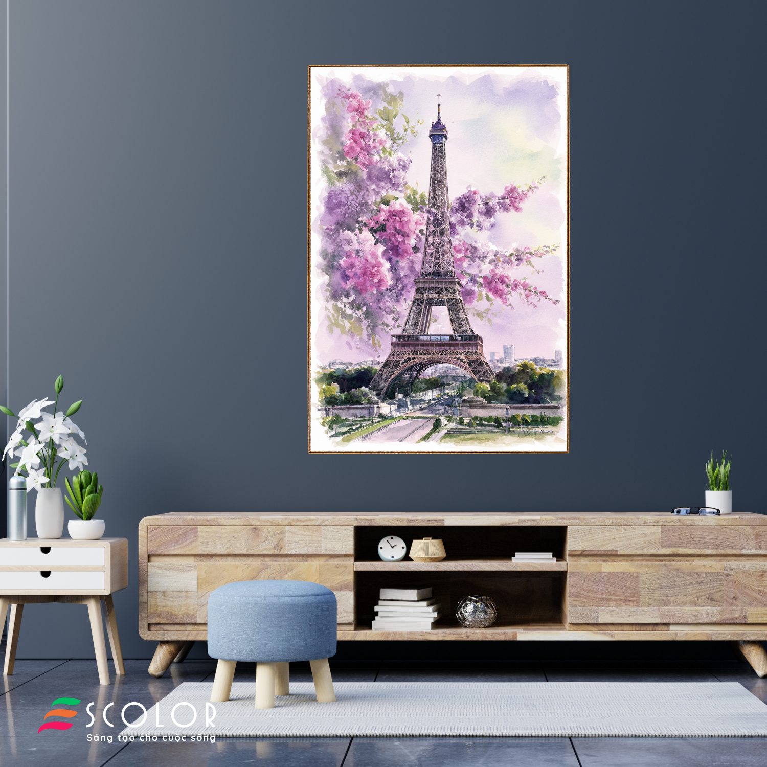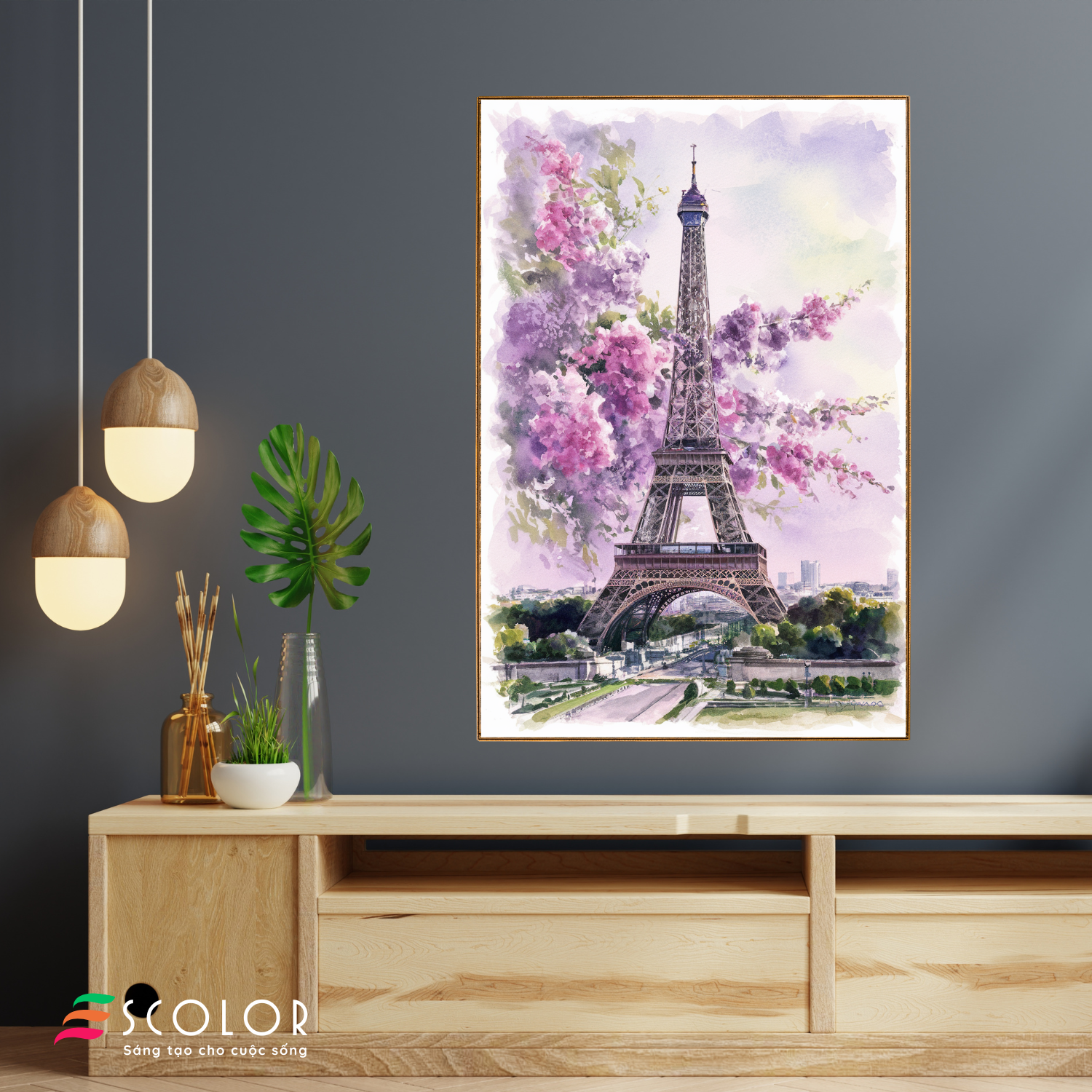 Bức tranh khắc họa tháp Eiffel nổi tiếng với nền trời xanh nhạt và những đám mây mờ. Những cành hoa tím hồng tươi sáng nổi bật phía trước, tạo nên sự tương phản dịu dàng và lãng mạn. Cảnh quan xung quanh tháp bao gồm những khu vườn xanh mát và con đường dẫn tới công trình kiến trúc vĩ đại này. Bức tranh mang lại cảm giác thanh bình, lãng mạn và gợi nhớ về mùa xuân tại Paris.