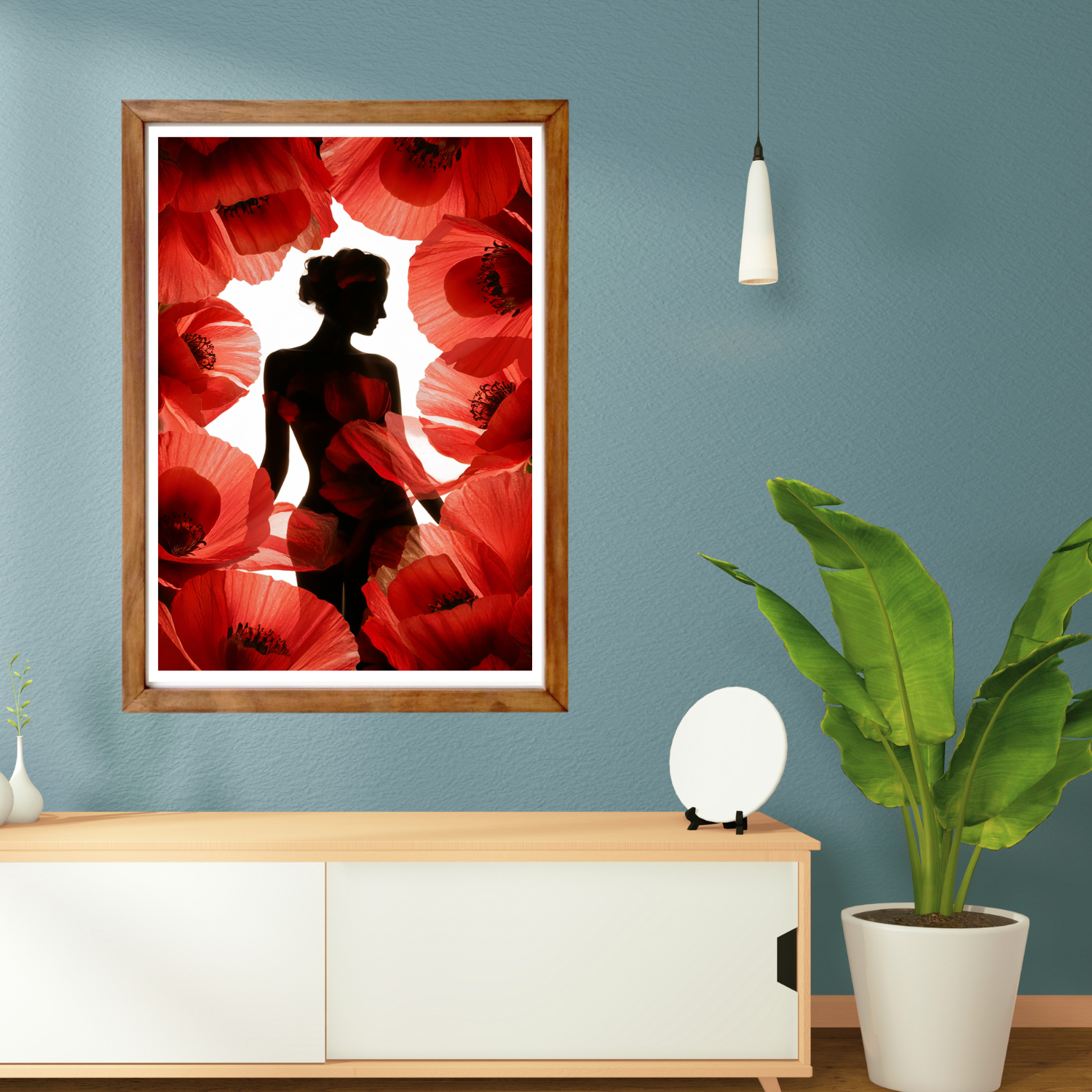 Bức tranh này thể hiện hình bóng của một người phụ nữ đứng giữa những bông hoa đỏ rực rỡ. Hình ảnh của cô được bao phủ bởi những cánh hoa mềm mại, tạo nên một sự hòa quyện tuyệt đẹp giữa con người và thiên nhiên. Ánh sáng phía sau làm nổi bật những đường nét tinh tế của cơ thể, đồng thời tạo ra một không gian huyền ảo và lãng mạn. Bức tranh gợi lên cảm giác về sự mỏng manh, sự hòa quyện của vẻ đẹp tự nhiên và con người, cùng với một chút huyền bí và quyến rũ.