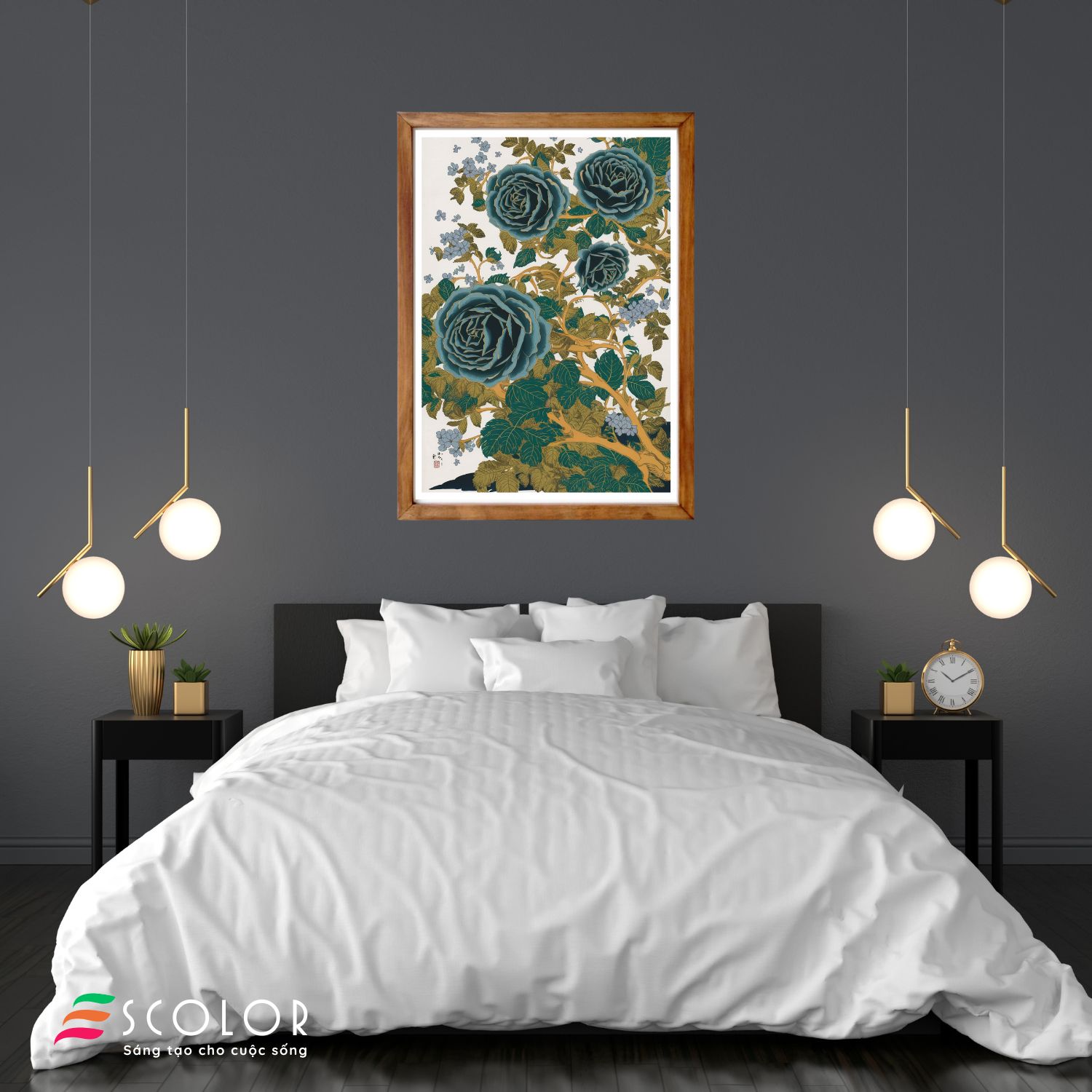 Bức tranh này khắc họa những bông hoa hồng xanh biếc nổi bật trên nền lá vàng và xanh đậm. Những cánh hoa mềm mại và tinh tế, được vẽ với sự tỉ mỉ và chính xác, tạo nên vẻ đẹp độc đáo và huyền bí. Lá và cành hoa đan xen nhau, tạo nên sự cân bằng hài hòa giữa các yếu tố. Những chùm hoa nhỏ màu tím nhạt xen kẽ, làm nổi bật thêm sự tinh tế và phong phú của bức tranh. Đây là một tác phẩm nghệ thuật đầy cảm hứng, tôn vinh vẻ đẹp tự nhiên và sự sáng tạo.