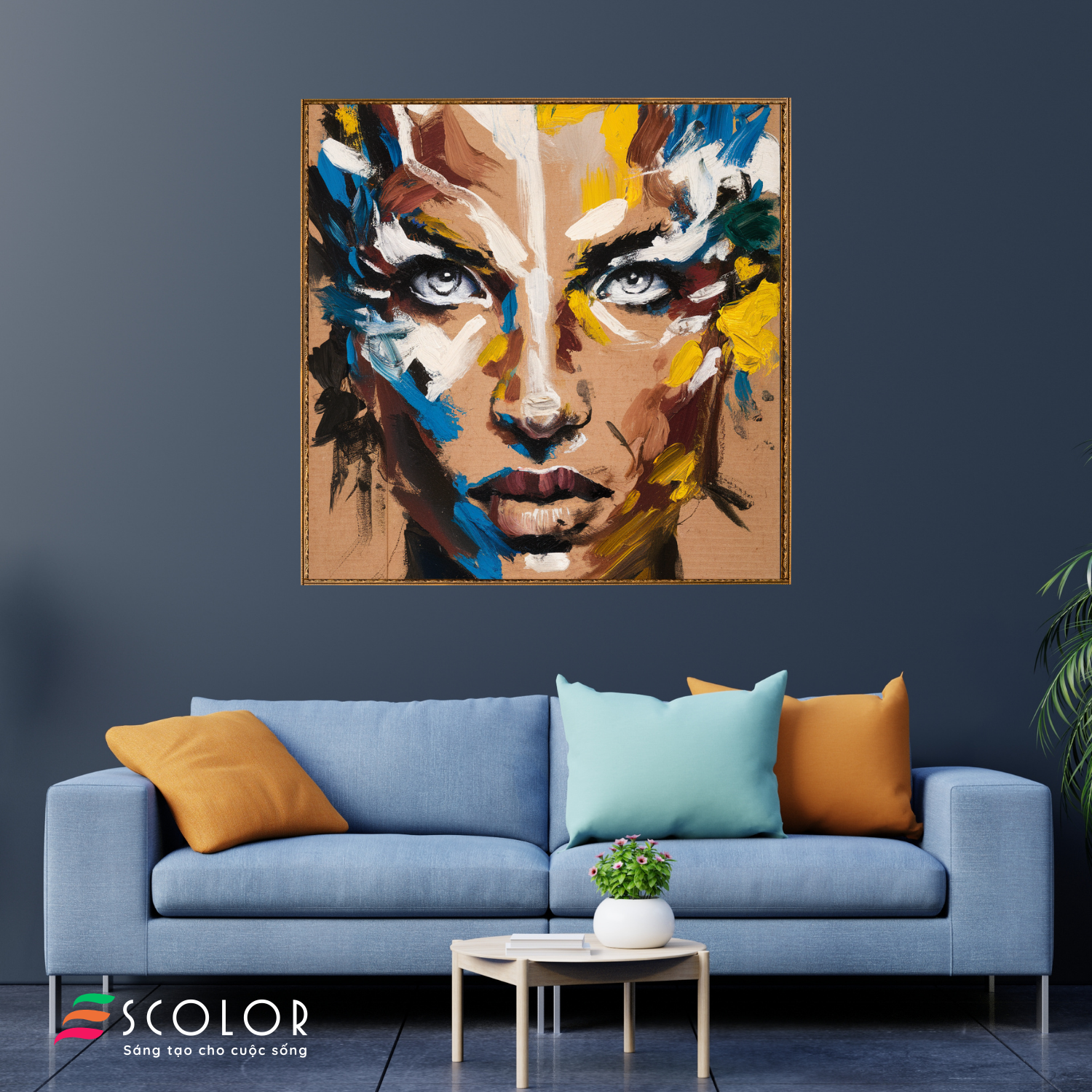 Bức tranh này miêu tả chân dung một người phụ nữ với ánh mắt mạnh mẽ và đầy biểu cảm. Các nét cọ dày và màu sắc táo bạo, gồm xanh, vàng, trắng và nâu, tạo nên sự tương phản mạnh mẽ và sự sống động cho bức chân dung. Ánh mắt của người phụ nữ như xuyên thấu, chứa đựng nhiều cảm xúc và suy tư. Những vệt màu không đều và phá cách làm tăng thêm sự độc đáo và hiện đại cho tác phẩm. Bức tranh này không chỉ là một tác phẩm nghệ thuật mà còn là biểu hiện của sức mạnh, sự phức tạp và vẻ đẹp của con người.